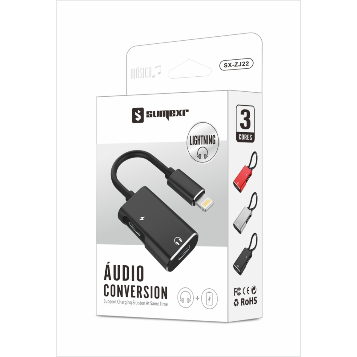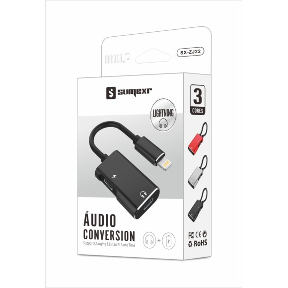 SX-ZJ22 Adaptador 2 em 1 lightning, perfeito para ouvir suas músicas enquanto carrega seu aparelho.